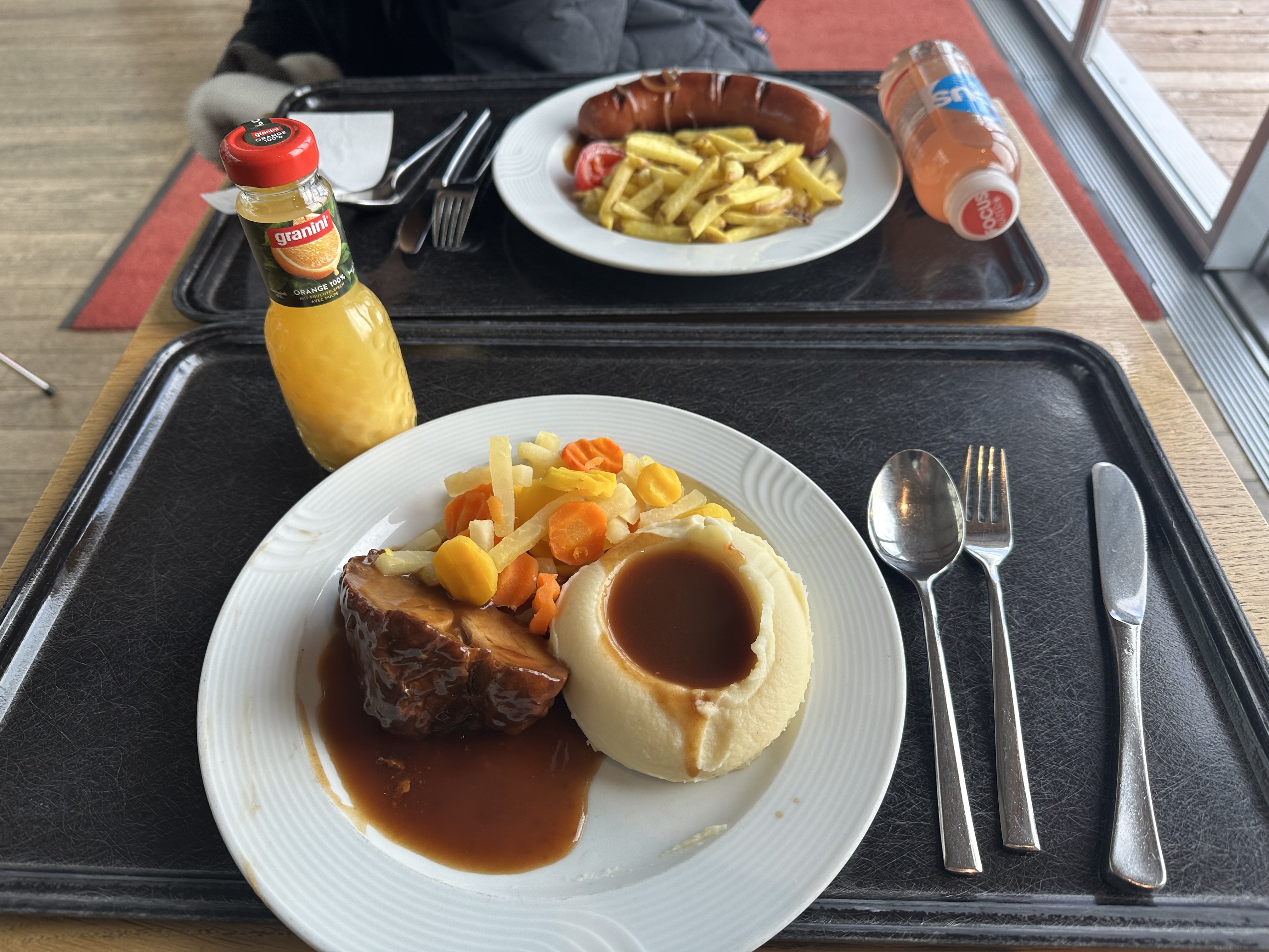 메뉴가 몇가지 있는데 앞에 가서 주문하면 쟁반에 차례로 받아오는 시스템이었어요.